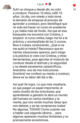 Maria Del Mar Arriola2022-08-05Trustindex verifica que la fuente original de la reseña sea Google. Cristina es una persona muy humana y cercana te ayuda mucho la recomiendo sin duda Bibi Saez2022-03-11Trustindex verifica que la fuente original de la reseña sea Google. Gracias a Cristina estoy superando mi miedo al coche e inseguridades a la hora de conducir. El método q usa y la energía q transmite, me ayudan a fortalecer mi autoestima y valor a la hora de coger el coche y ponerme en la carretera. 1000% recomendable!! Inés González2022-01-25Trustindex verifica que la fuente original de la reseña sea Google. Nunca dejaré de agradecer q Cristina se cruzara en mi vida. A parte de muy profesional, tiene una empatía q hace q tus miedos Se minimicen xq hace q sean compartidos. El trabajo q hace no es sólo q no tengas miedo a la conducción, sino a encontrar tu historia para averiguar de donde viene ese miedo y poder atacar ese foco, conocerlo, y q te acompañe pero no con miedo sino con herramientas para saber cómo actuar. Este tipo de miedo además es algo q es difícil de comunicar, no es entendible y no está como socialmente admitido. Yo tengo carnet hace muchos años y siempre ha habido algo q ha impedido q fluyera esa conducción normal, pero no podías hablar con nadie xq es como ...perdona??? ....pero si tienes el carnet?? ....y??? Al final encierras tu vergüenza con tu miedo. Gracias a Cristina, a hacernos ver q esto es más común de lo q parece, técnicas, y su aprendizaje he avanzado muchísimo y cada paso q doy , abre otro nuevo y así superar esas situaciones y ese miedo q acompaña una historia q con Cristina aprendemos a conocer y a afrontar. Así q gracias, gracias y gracias x ser como eres y gracias x la ayuda q siempre nos has ofrecido en los cursos y fuera de ellos. Myriam Julia Campos2022-01-24Trustindex verifica que la fuente original de la reseña sea Google. Recomiendo en primera persona acercarse a Cristina y dejarse ayudar por ella. Cuando la conocí buscando en la web este problema que acababa de presentarse en mi vida fue como una luz en todas mis tinieblas. Es una gran profesional que además transmite con nobleza y dulzura como enfrentarse a los miedos y a los bloqueos. La recomiendo 100%. Mi caso está vinculado a la ansiedad y al estrés....siempre fui una conductora sin problemas hasta que un día sucedió y me vi afectada por este miedo a conducir. Cristina me ha ayudado a entenderlo y a trabajar para superarlo. Paloma Chaparro Briones2022-01-14Trustindex verifica que la fuente original de la reseña sea Google. Me saqué el carnet de conducir con 18 años y jamás volví a coger el coche. Tras 20 años,lo intenté en 2 autoescuelas y sólo Cristina ha logrado que coja mi coche, sola o acompañada. Parece mentira que estando tan lejos físicamente, haya estado y esté tan cerca para acompañarme en el proceso y la aventura de perder el miedo a conducir. Gracias Cristina x tanto. vanesa reino2022-01-10Trustindex verifica que la fuente original de la reseña sea Google. Me saque el carnet y a los pocos meses deje de conducir pues me producía ansiedad ,una gran rigidez y bloqueo. Vivo en un pueblo y no conducir me limitaba mucho. Cuando hice el curso con Cristina llevaba 4 años sin conducir. .Cristina es una increíble profesional llena de paciencia y empatía ,me enseñó a detectar de dónde venía ese miedo , a ganar confianza en mí misma y poder relajarme . Llevo meses conduciendo y ahora cojo el coche cada día .He conseguido lo que nunca pensé que alcanzaría :disfrutar de la conducción . Sin duda para mí ha sido de las mejores cosas que me han pasado.